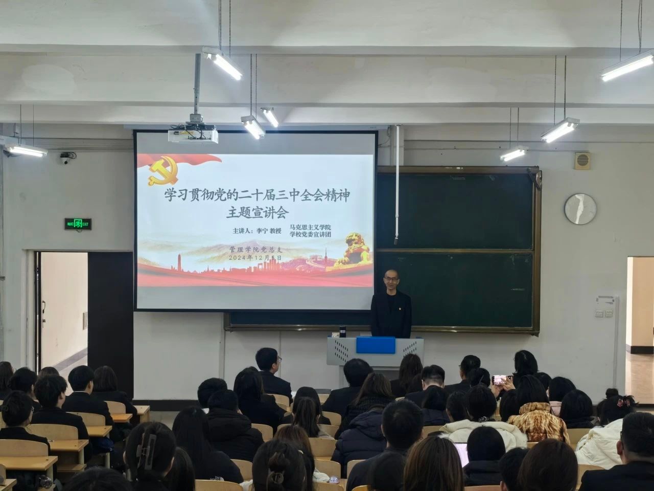 近日,伟德国际victor1946党总支在业精楼B205召开学习贯彻党的二十届三中全会精神主题宣讲会,宣讲会由伟德国际victor1946党总支书记鲍宇主持,邀请马克思主义学院、学校党委宣讲团李宁教授为全院师生党员进行以“进一步全面深化改革,开辟中国式现代化广阔前景”为主题的学习领悟党的二十届三中全会精神宣讲会。