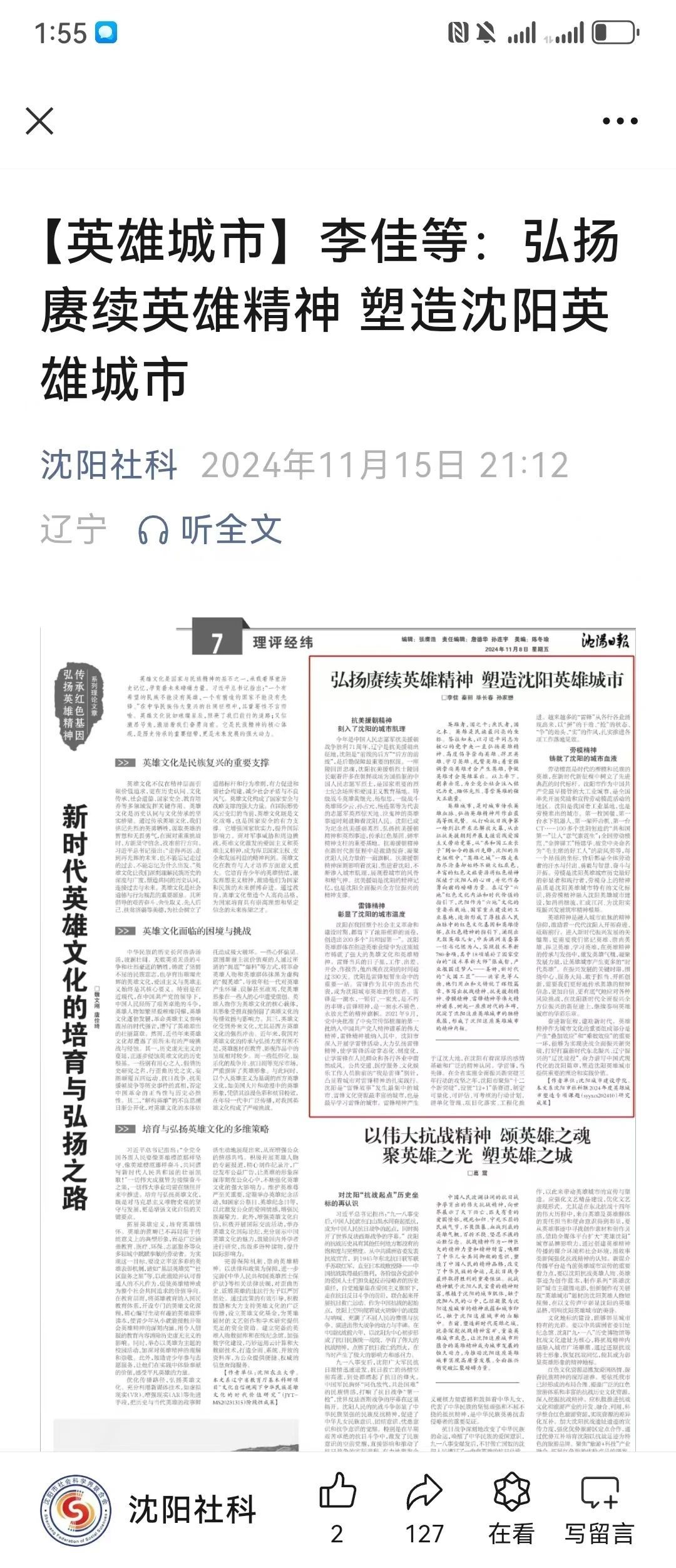 11月8日,沈阳日报刊登了我校伟德国际victor1946李佳、毕长春、孙佳懋、秦丽共同执笔撰写的文章《弘扬赓续英雄城市 塑造沈阳英雄城市》,该文章系沈阳市社科联2024年度英雄城市塑造专项课题(syyxcs202410)研究成果,同时沈阳社会科学界联合会官方公众号公开发表。这不仅是对我校教师学术研究成果的肯定,更是对沈阳这座城市深厚历史底蕴与时代精神的颂扬。