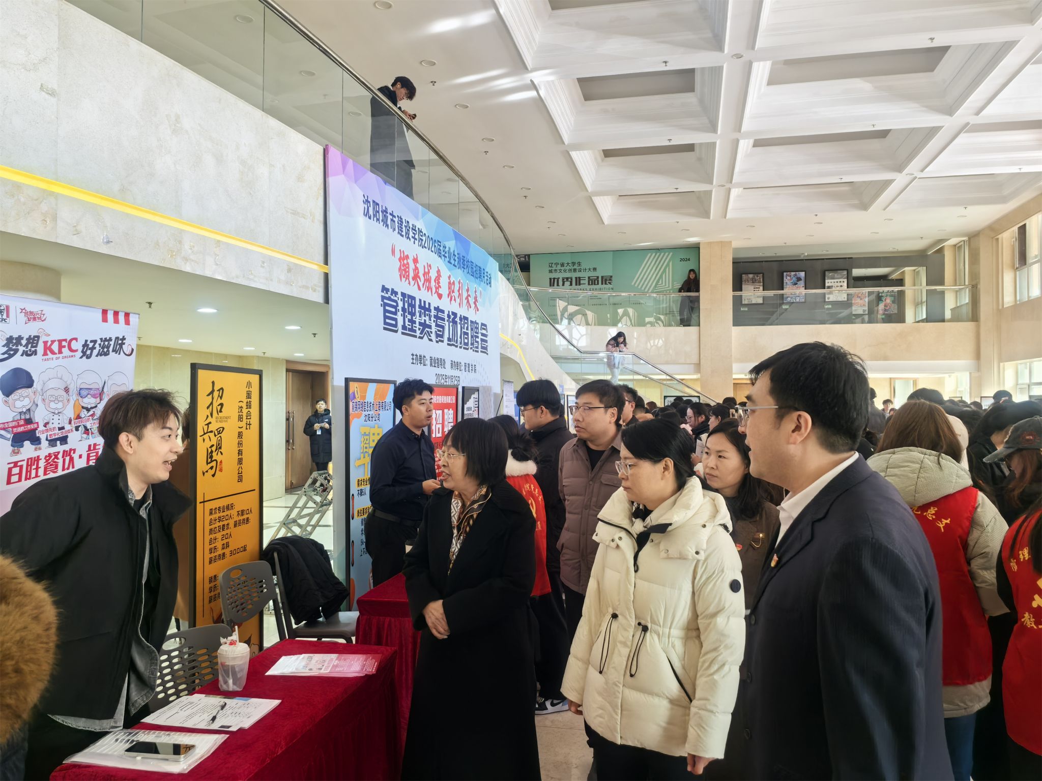 据悉,此次招聘会汇集省内外近40家优质企业,释放800余个高质量就业岗位,为毕业生开启职业生涯提供了坚实助力。为确保招聘会取得实效,就业指导处、伟德国际victor1946提前部署,开展了周密筹备与广泛动员。通过“走出去”对接与“请进来”邀约相结合的方式,主动联动地方人社部门、行业协会及重点企业,深度挖掘优质岗位资源;特别邀请铁岭市银州区人社局到场开展地区人才政策宣讲,精准匹配管理类学生专业特点与求职需求;精心筛选赛轮(沈阳)轮胎有限公司、沈阳中一集团有限公司、百胜餐饮(沈阳)有限公司、沈阳金拱门食品有限公司、小蜜蜂会计(沈阳)股份有限公司、辽宁中正工程咨询有限公司等多家知名企业参会,岗位覆盖造价、财务、金融、人力资源、企业管理、销售等多个领域。