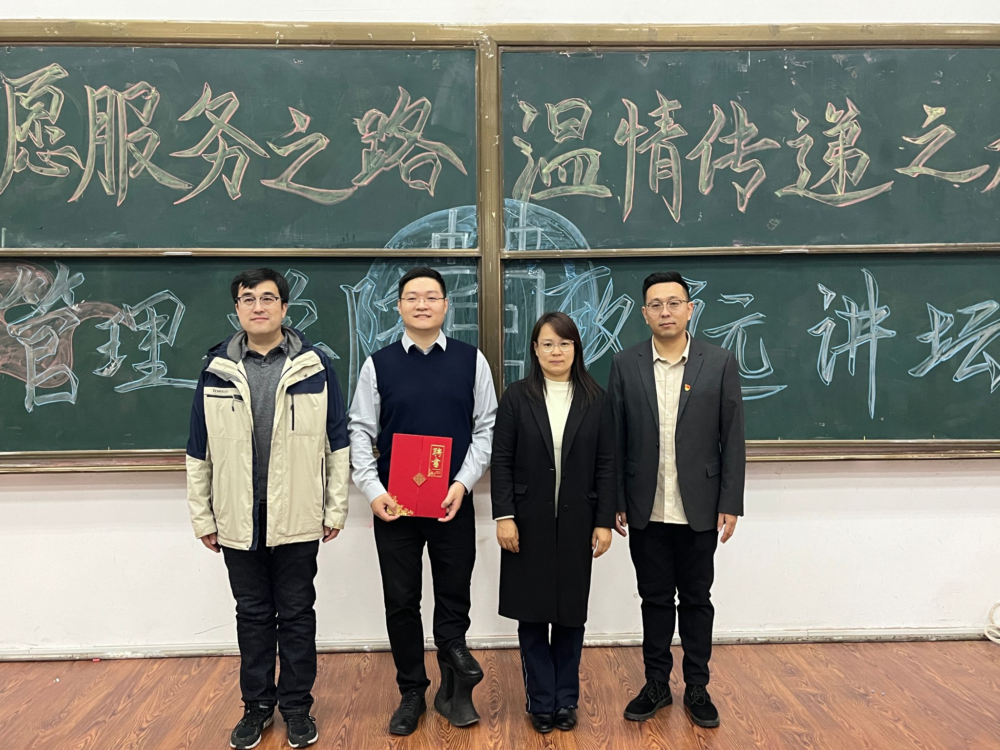 李厚艳为赵强颁发志愿服务校外指导教师聘书。