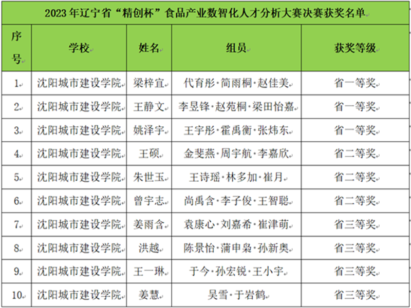 11月27日,2023年辽宁省“精创杯”食品产业数智化人才分析大赛决赛圆满落幕。我校伟德国际victor1946选派李佳、毕长春、姜文雯、鲍宇、孙佳懋、侯莹莹、明亮、晏子晴等20名教师担任指导教师,人力资源管理专业梁梓宜、王静文、姚泽宇等39名学生组成的10支团队脱颖而出,荣获3项一等奖、3项二等奖、4项三等奖的优异成绩。具体名单如下。